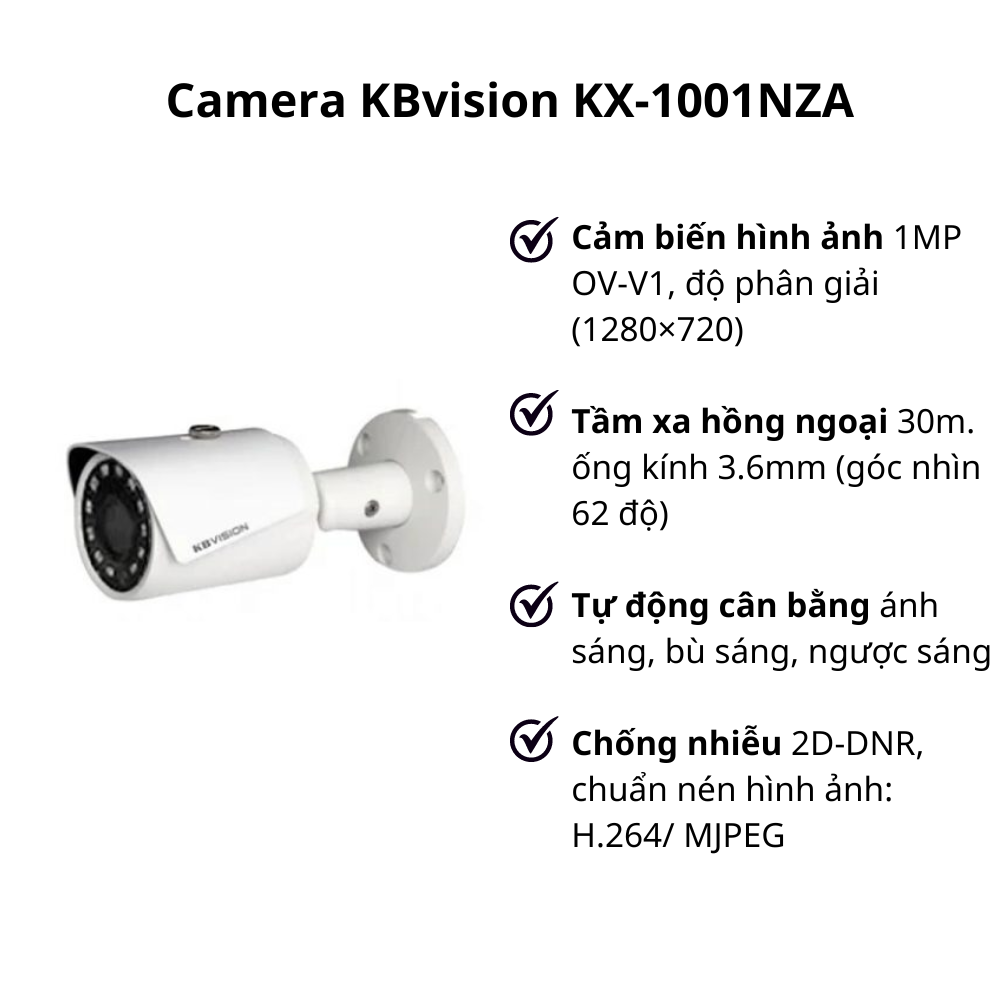 Camera KBvision KX-1001NZA còn được trang bị công nghệ chống nhiễu 2D-DNR, công nghệ tự động cân bằng ánh sáng, bù sáng, chống ngược sáng. Kết nối Camera hỗ trộ 20 user truy cập đồng thời . chuẩn nén hình ảnh: H.264/ MJPEG