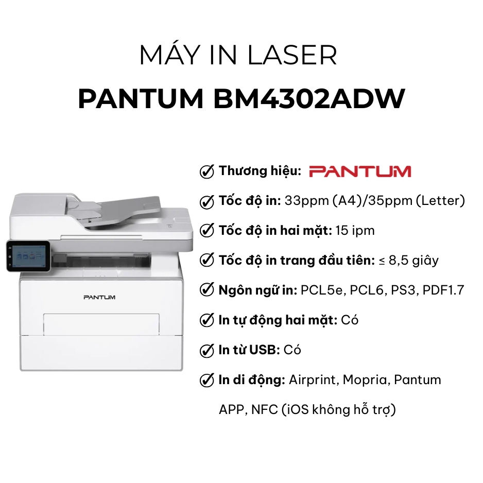 In di động: Airprint, Mopria, Pantum APP, NFC (iOS không hỗ trợ)