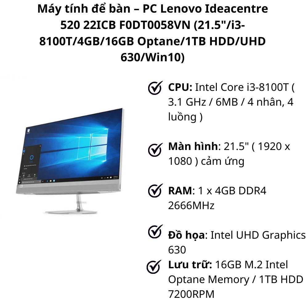 Máy tính để bàn – PC Lenovo Ideacentre 520 22ICB F0DT0058VN (21.5″/i3-8100T/4GB/16GB Optane/1TB HDD/UHD 630/Win10)